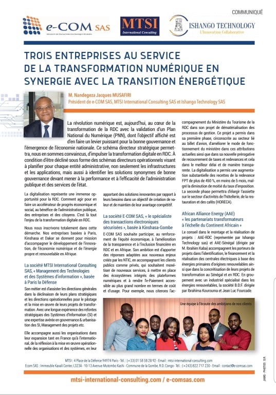 La société e-COM SAS met son savoir-faire sur les technologies dont celles relatives aux évolutions des terminaux de paiement pour proposer des outils adaptés aux contraintes de la RDC et à la gestion complexe d’un parc d’équipements monétiques.